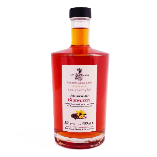 Die Blutwurzel wird mit Topinambur angesetzt und gibt ihm die typische rote Farbe und Geschmack - weit entfernt von einem Kräuter-Likörchen.
